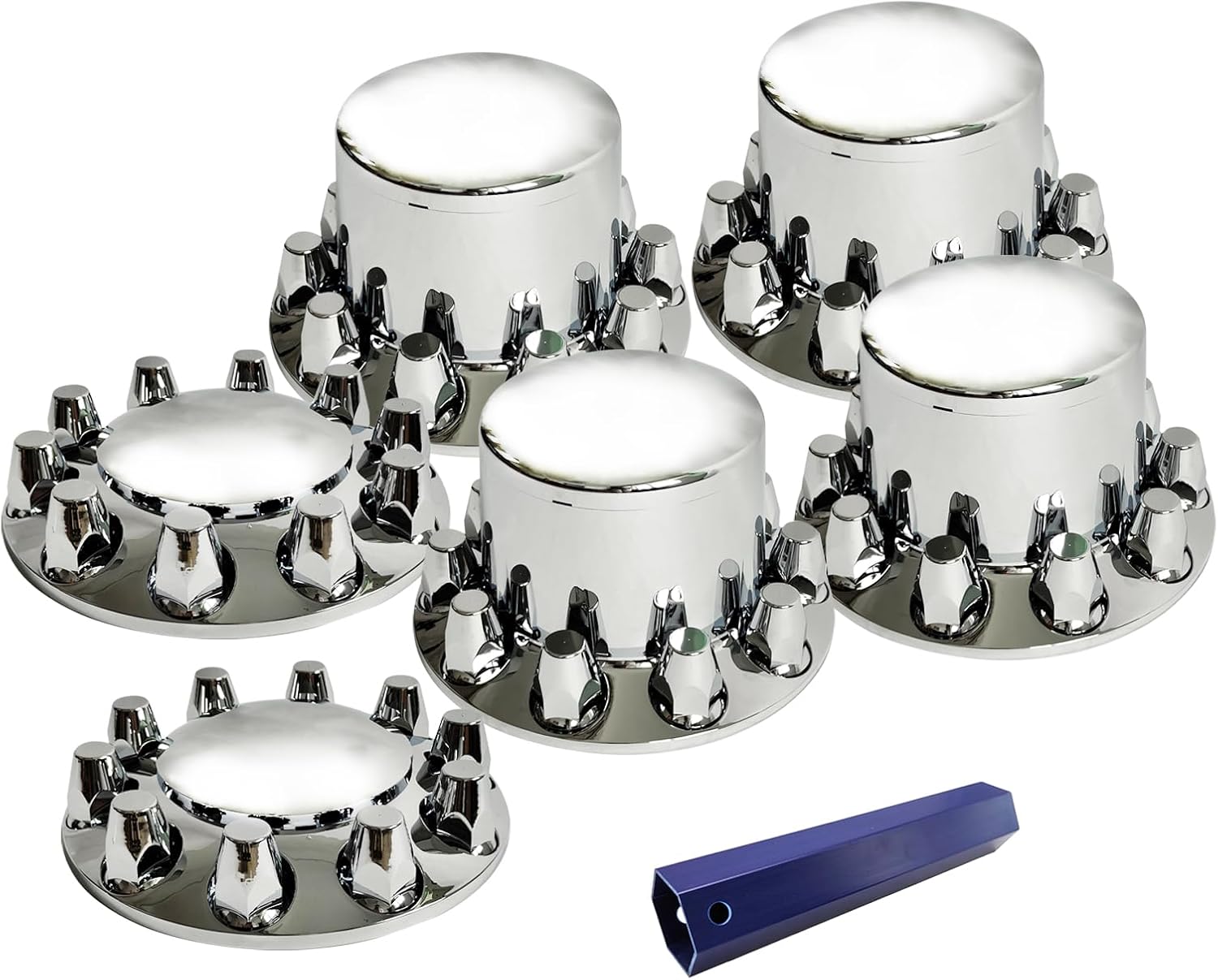 Features: 100% brand new Material: ABS Plastic Color: Sliver Lug nut covers: 2 3/4" height X 2 3/16" width Compatible with the following: Universal Fit. Fit most semi truck: Freightliner, Volvo, Kenworth, Mack, Peterbilt, International. With 20", 22 1/2", and 24 1/2" 10 lug wheels and 33mm lug nut. Package included: 4 X Rear Axle Cover Cap 2 X Front Axles Cover Cap 60 X 33mm Screw-on Lug Nut Covers 6 X Plastic Gaskets 1 X Wrench